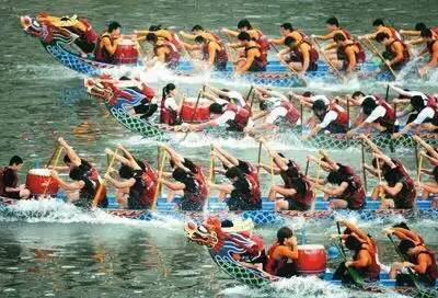 賽龍舟:當時楚人因舍不得賢臣屈原死去,于是有許多人劃船追趕拯救。他們爭先恐后,追至洞庭湖時不見蹤跡,是為龍舟競渡之起源,后每年五月五日劃龍舟以紀念之。借劃龍舟驅散江中之魚,以免魚吃掉屈原的尸體。競渡之習,盛行于吳、越、楚。清乾隆二十九年臺灣開始有龍舟競渡,當時臺灣知府蔣元君曾在臺南市法華寺半月池主持友誼賽。現在臺灣每年五月五日都舉行龍舟競賽。香港有競渡,近來英國人也有仿效我國人作法,組織鬼佬隊,進行競賽活動。